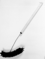 Nylon twisted into galvanized wire, mounted on a metal shank and attached to a handle by a swivel joint. Brush part is 8 inches long, and 2 inches in diameter. Overall length, 22 inches.