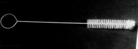 On stainless steel wire. Brush part is 3 1/2 inches long, 3/4 inch in diameter. Overall length, 9 inches.