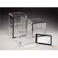 Provide dust- and moisture-free storage in refrigerators and freezers, and on the benchtop. Neoprene gasket on door ensures a tight seal. Removable, lipped tray holds solid desiccant. Models are available with 2, 3, and 4 shelves with adjustable grooves for 3, 5, and 7 positions, respectively. Shelves are removable, adjustable, and vented to maximize air flow.