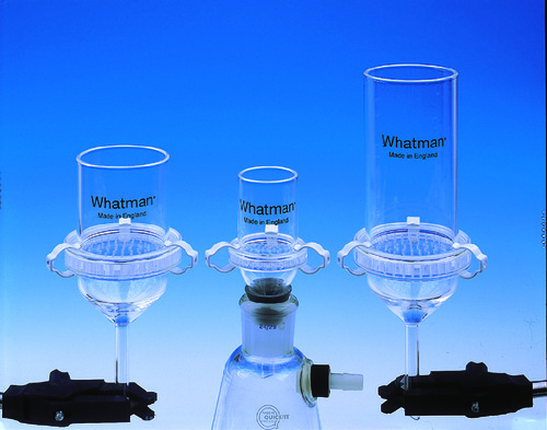 Three-piece construction permits quick filter changing and easy cleaning. Reservoir, base and stem are borosilicate glass with ground contact flanges. Clamping pressure provides a leak-tight seal. Solutions pass through filter and all retained solids are deposited within filter circle. Clamps are plastic-coated for chemical resistance. Replaceable filter support plates of transparent acrylic are suitable for most aqueous solutions and some dilute acids at working temperatures to 65°C maximum.
