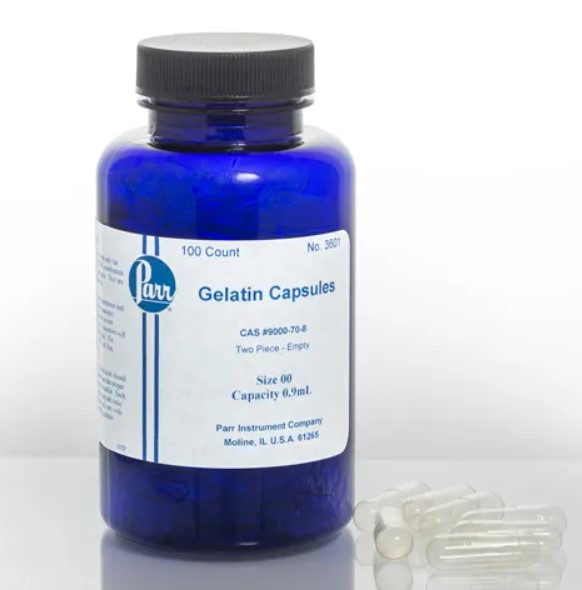 Recommended for holding liquid samples to be burned in oxygen combustion bombs. Have uniform combustion characteristics and low sulfur content. Heat of combustion, sulfur analysis and directions printed on bottle label. Capsule size is 00, capacity, 0.9 mL. Packed in bag of 100 units. (Parr 3601)