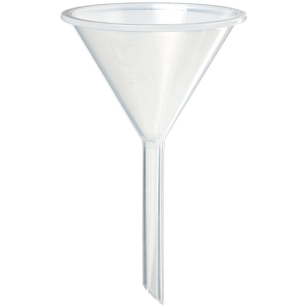 Heavy-duty, polypropylene plastic funnel with smooth walls, 60 degree cone angle, and long stem.