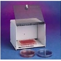 This incubator will not only hold 14 microtiter plates, but it will also incubate petri dishes or up to 54 test tubes in specially designed mini-racks. Developed for applications such as RIA, EIA, FIA, ELISA, culturing, kinetics, enzymatic incubation, temperature equilibration, hybridoma screening - and any other technique that requires incubation at or near 37°C. Although the incubator is pre-set at 37°C, it can be adjusted from 32 to 42 degrees as needs or conditions require. Aluminum inner body with white Kydex™ outer cover.