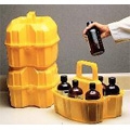 Holds up to six half-liter bottles. Bottles are completely enclosed and remain separated. Cover snaps on securely. Handle is one-piece molded to base. Has high impact resistance and rigidity. Stackable, empty or full; color is yellow for safety. 14 x 10 x 11 inches high.
