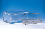 Slide staining dish accommodates 50 capacity slotted stainless steel rack with hinged handle to permit closure of dish. Accepts 3 x 1 inch, 3 x 1 1/2 inch and 3 x 2 inch slides. Inside dimensions of dish are 185L x 88W x 68D, mm. Manufactured from soda-lime glass.