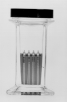For staining, or as a solvent preparation chamber in micro, thin-layer chromatography. Holds five single 3 x 1 inch slides vertically, or 10 slides back-to-back. Plastic screw cap is metal foil faced to withstand organic solvents or stains and to prevent evaporation. Overall height, without cap, is 4 5/16 inch. Cap size is 58-400.