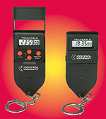 Three-in-one timer with key chain clip. Functions include countdown timer with alarm, stopwatch and time-of-day clock. Can be programmed to countdown from 24 hours to 1 minute in one-minute increments. LCD display always shows time remaining in hours, minutes, and seconds. When the display reaches zero, a loud beeping alarm sounds for 15 seconds then automatically turns off. Stopwatch mode times up from 1 second to 23 hours, 59 minutes, 59 seconds and has a time-out feature. Time-of-day clock may be set to the second in a.m./p.m. or 24-hour military time. Four-button operation is fast and easy. Offers quartz-crystal accuracy to 0.01%. Supplied with certificate traceable to NIST standard. Housing is chemical resistant ABS plastic with clip. Dimensions are 1 3/4 x 1 x 1/4 inches and weight is 1/2 ounce. Supplied with 2 year, continuous use, replaceable battery.